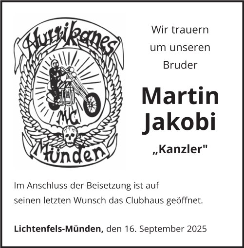 Die Trauerfeier mit anschließender Beisetzung ist am Freitag, dem 19. September 2025, um 14:00 in der Marienkirche in Münden.